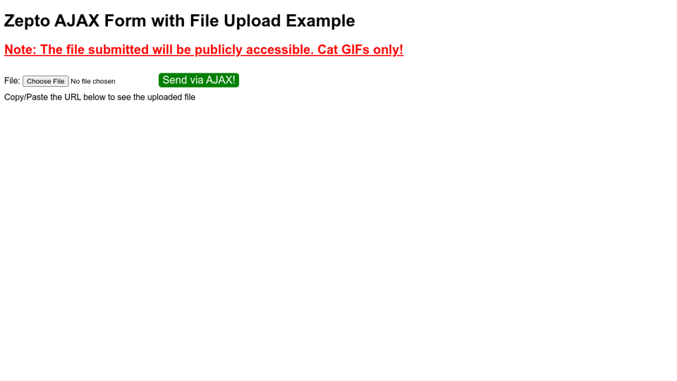 Zepto ajax file upload. In order to upload files with Ajax we are going to use FormData. Our JavaScript will ensure that. The AjaxFileUpload control also supports a drag-and-drop interface.